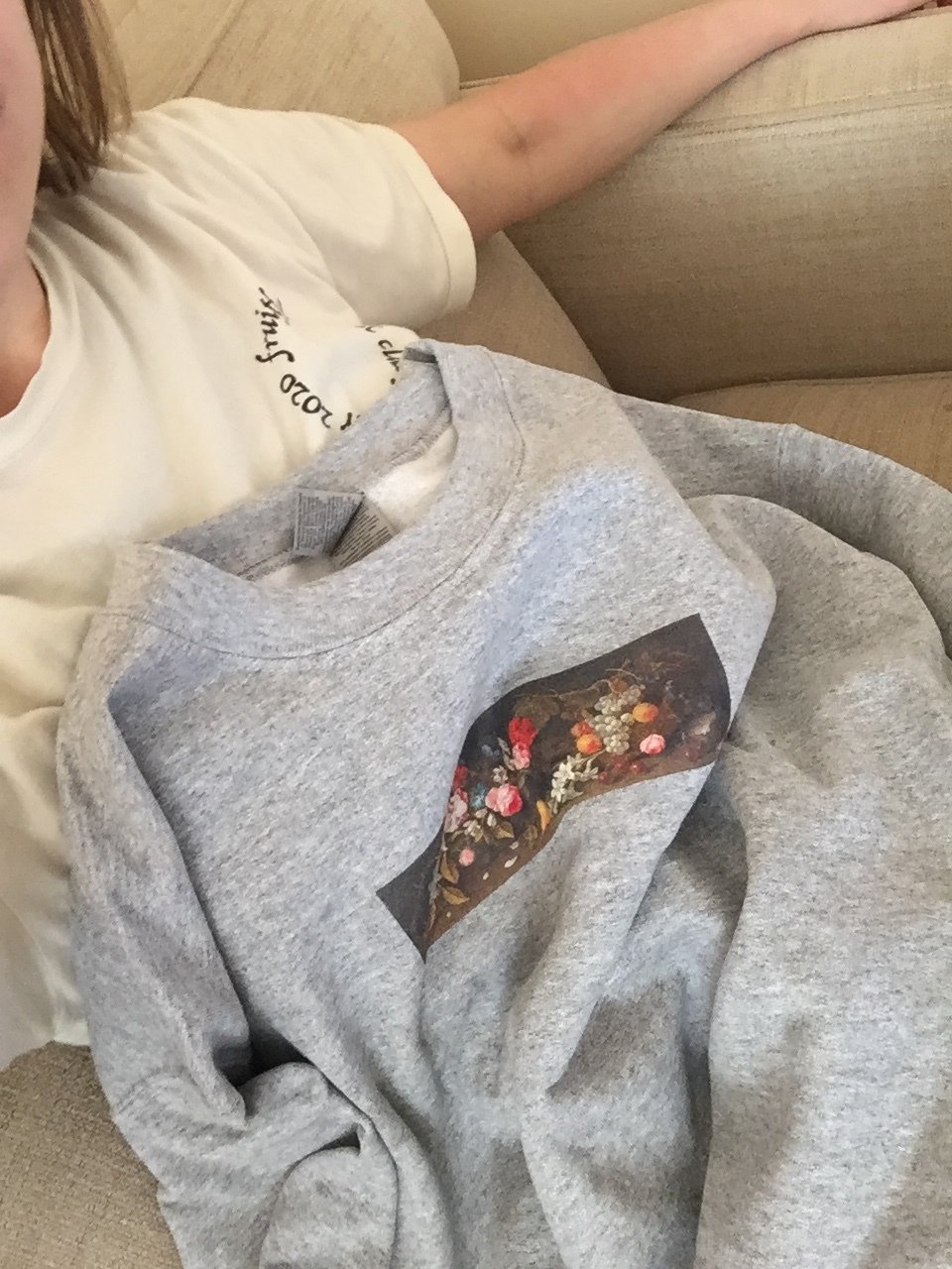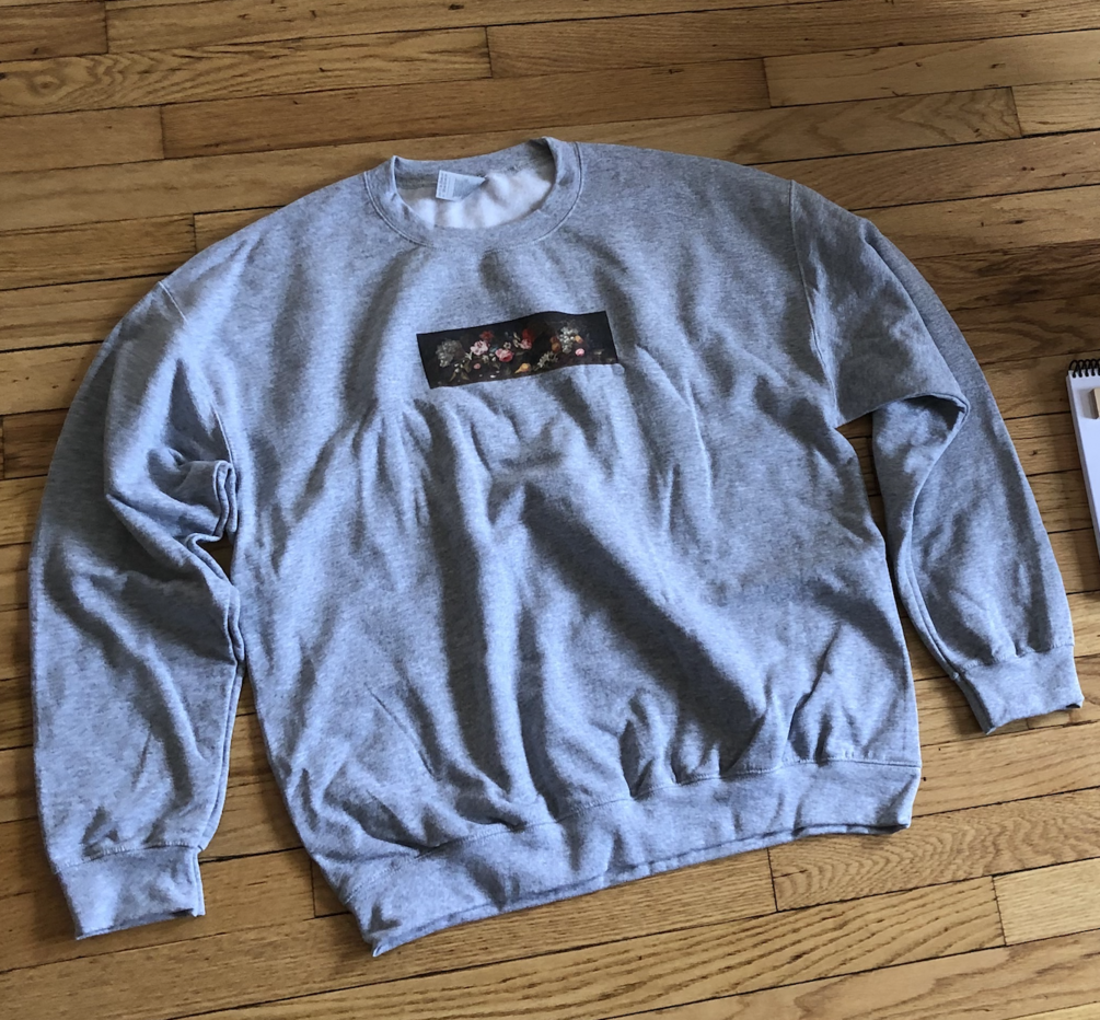 Fruitful School's fall sweatshirt is gray, printed on front and back. On the front is a small landscape-oriented still life oil painting of fruits and flowers by Giovanni Stanchi (1608–1673), and on the back is a large, circular fruitful school crest in a cursive font, "fruitful.school day mode, fall 2020."